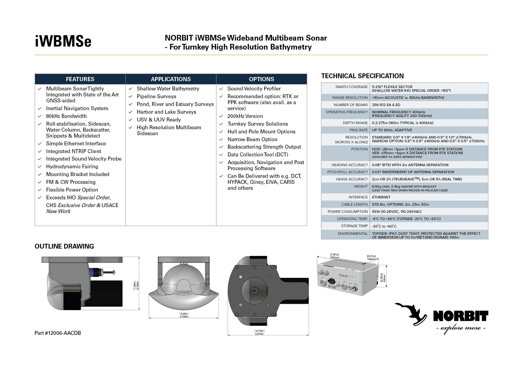 The iWBMSe is an ideal choice for protected waterway bathymetric surveys; it may be mobilised on any vessel of opportunity and offers streamlined operability and good performance to match budget and project requirements. Additionally, the kit provides the industry’s highest resolution multibeam sidescan and snippets for wide swath shallow water applications. The WBMS sonars are based on a state of the art analogue and digital platform featuring powerful signal processing capabilities, offering roll stabilized bathymetry and several imagery and backscatter output. With broad R&D expertise, NORBIT has developed, from the ground-up, exciting new technology that allows existing and new applications to benefit from the advantages offered by a compact wideband curved-array multibeam sonar.